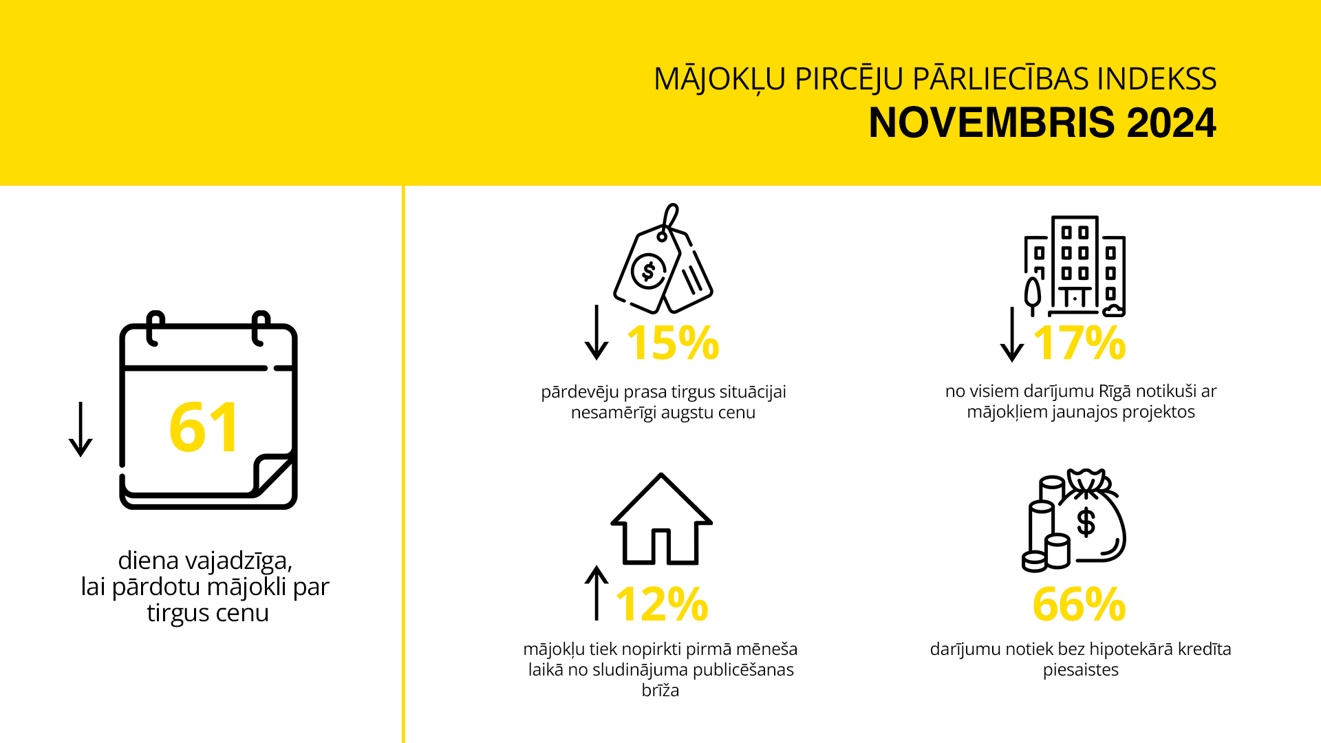 - 61 diena – vidēji tik ilgs laiks bijis nepieciešams, lai pārdotu mājokli par tirgus cenu (63 – oktobrī; 65 – septembrī; 65 – augustā; 70 – jūlijā; 70 – jūnijā; 75 – maijā);
