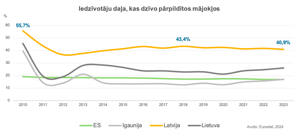 Tai pat laikā Latvija ir līdere Eiropas Savienībā pēc iedzīvotāju īpatsvara, kas spiesti dzīvot pārpildītos mājokļos, turklāt šajā kategorijā apsteidz ne vien vidējo ES rādītāju (17%), bet arī Lietuvu un Igauniju. Par pārpildītu mājokli tiek uzskati apstākļi, kuros dzīvojamā platība uz vienu iedzīvotāju ir nepietiekami, tādējādi negatīvi ietekmējot kopējo dzīves kvalitāti. Šo problēmu īpaši izjūt daudzbērnu ģimenes un iedzīvotāji reģionos, kur jaunu mājokļu piedāvājums ir ierobežots. Latvijā šādos apstākļos dzīvo teju 41% iedzīvotāju. Lai gan kopš 2010. gada rādītājs ir krities, tas joprojām ir augstākais starp Baltijas valstīm.